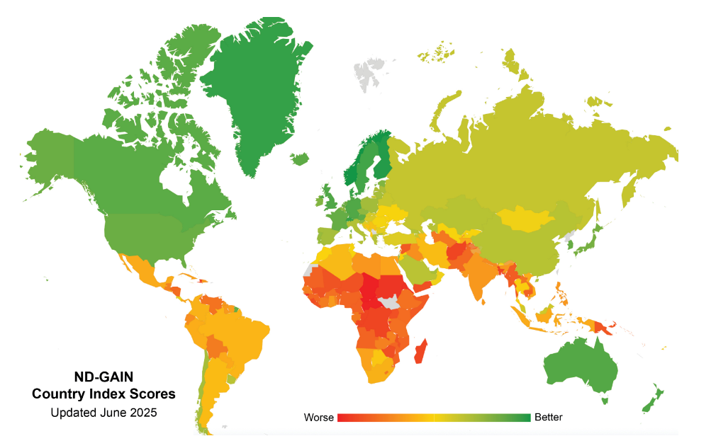 برای آنکه بدانیم در چه موقعیتی هستیم، باید به ابزارهای علمی و معتبر جهانی تکیه کنیم. یکی از مهمترین این ابزارها شاخص ND-GAIN است؛ شاخصی که توسط دانشگاه نوتردام آمریکا طراحی و از سال ۲۰۱۳ بهطور منظم بهروز میشود. این شاخص تصویری جامع از توانایی کشورها در مقابله با تغییرات اقلیمی ارائه میدهد و به رهبران کمک میکند تصمیمهای خود را نه بر اساس حدس و گمان، بلکه بر پایه دادههای علمی اتخاذ کنند. ND-GAIN در حقیقت دو بُعد اصلی را بررسی میکند: