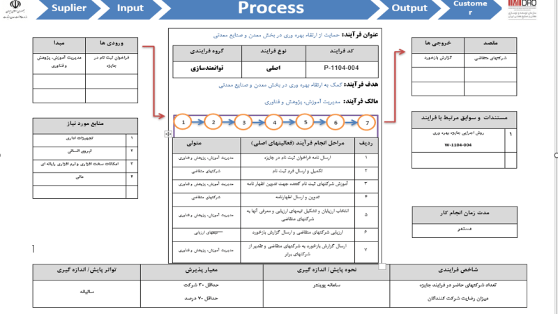 - شرح خدمت:‌ ارزیابی شرکتهای بخش معدن و صنایع معدنی و ارائه گزارش بازخورد شامل نقاط قابل بهبود و نقاط قوت به شرکتها به منظور توانمندسازی و افزایش بهره‌وری.