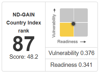 طبق آخرین گزارش (۲۰۲۳)، ایران در شاخص جهانی ND-GAIN رتبه ۸۷ را میان بیش از ۱۸۰ کشور کسب کرده است. این رتبه نشان میدهد که ایران در میانه جدول، اما با فاصله قابل توجه از کشورهای پیشرو قرار دارد.
